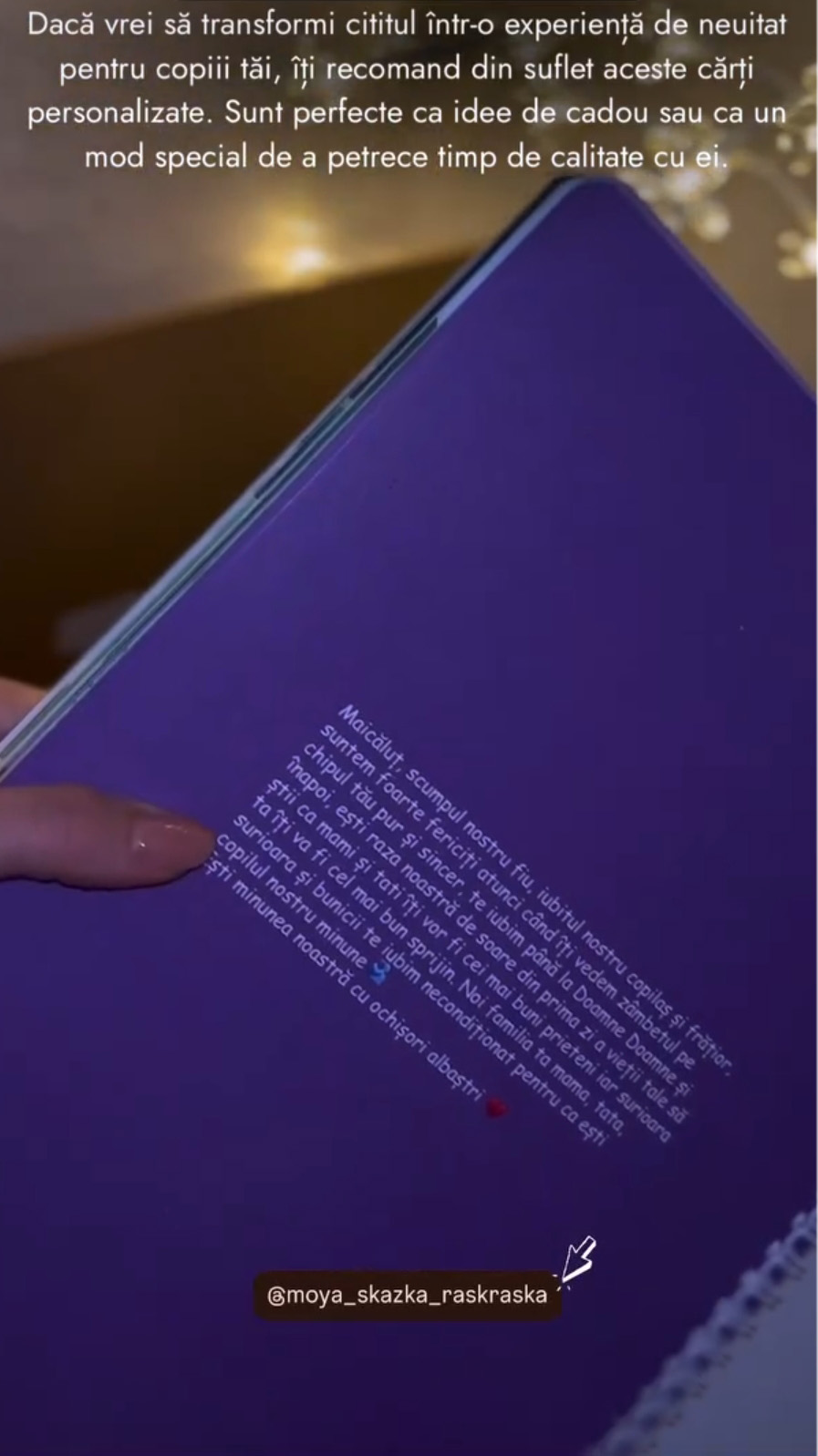 Nu este doar o distracție, ci și o investiție în dezvoltarea copilului. Cadoul este creat individual — include numele copilului, înfățișarea lui și chiar un mesaj cald din partea celui care oferă darul, imprimat în carte.