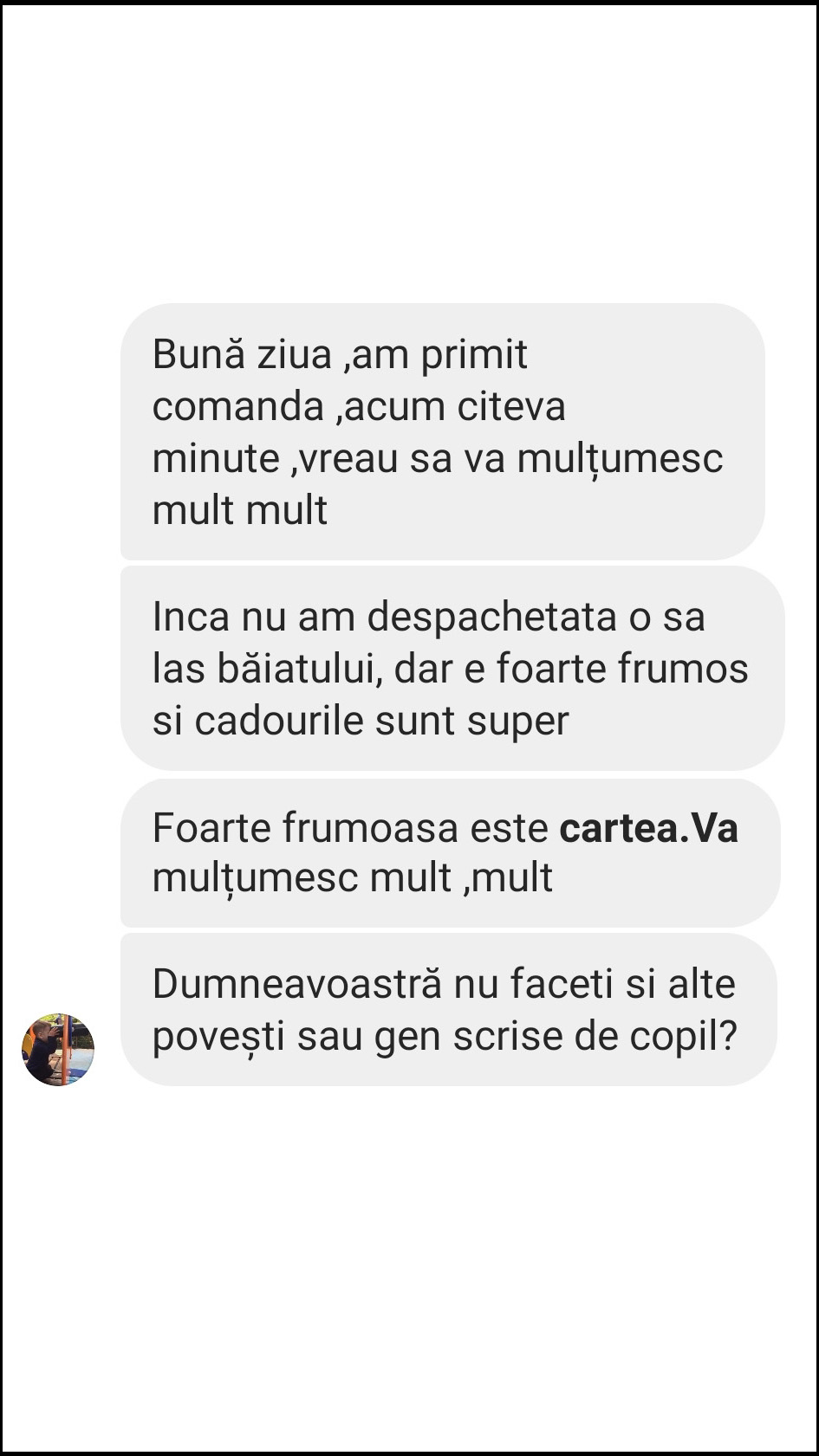 Deocamdată, nu există o astfel de opțiune. Avem două povești pregătite — una pentru fetițe și una pentru băieți. Le personalizăm pentru copilul dumneavoastră: adăugăm numele său, culoarea părului, a ochilor și a pielii, precum și numele mamei (menționat în text, dar fără imagine). Pe ultima pagină puteți adăuga un mesaj personal — cuvinte calde sau o felicitare. Dacă doriți, pe copertă și pe pagina de titlu apare un personaj cu trăsături realiste inspirate din fotografia copilului!